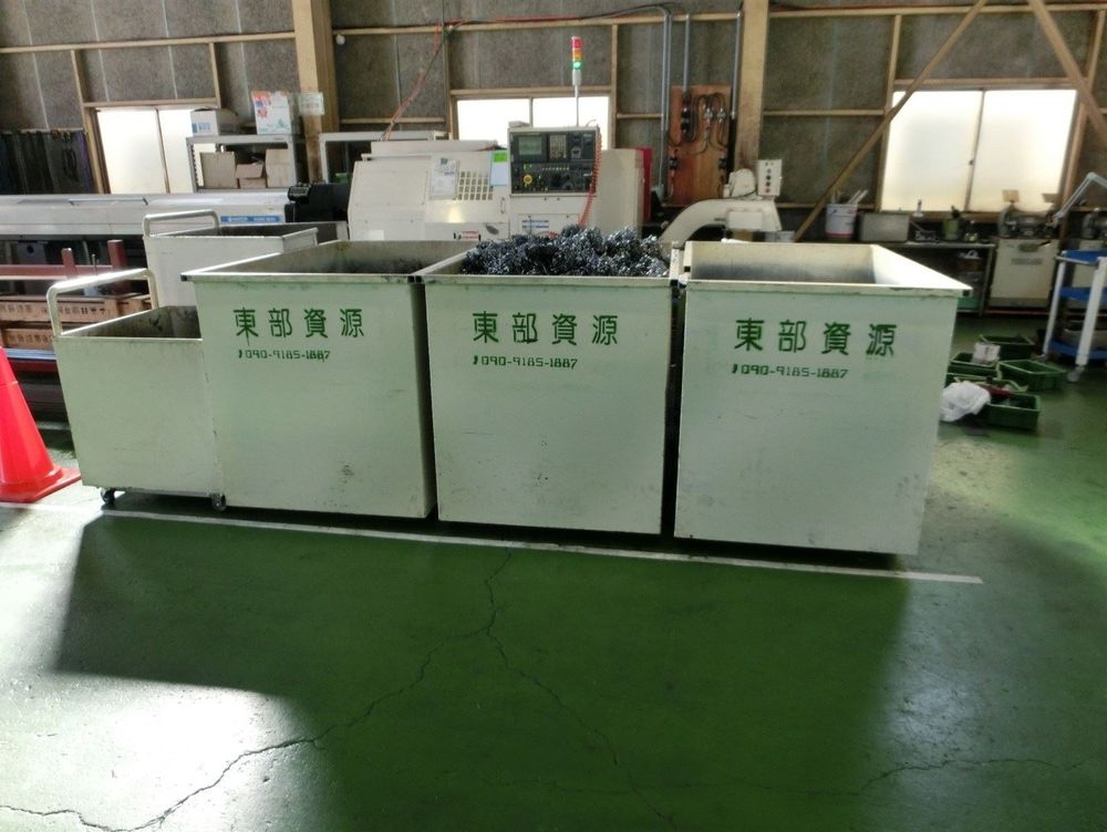 新第二工場のメリットは広さです。切削スクラップの箱を大きくし、交換サイクルを伸ばすと共に積載時のタイムロスを削減しました。