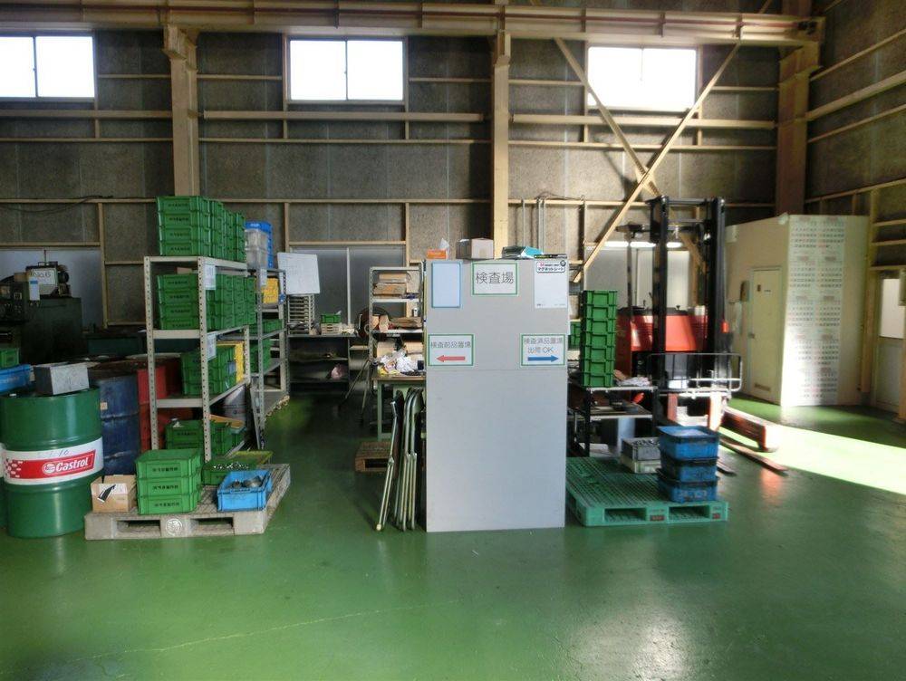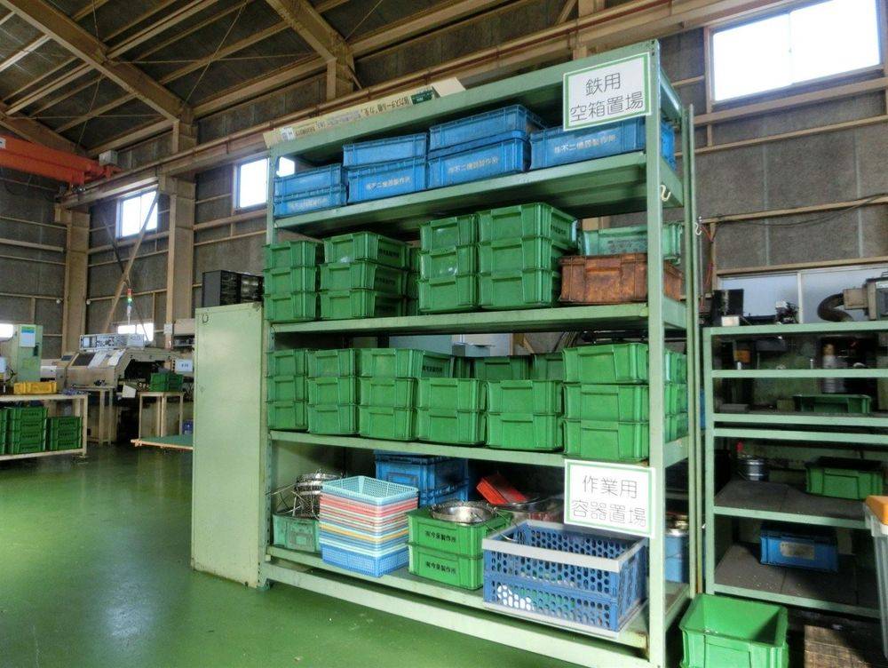 機械で加工された製品は作業用箱に入れて検査場へ移動します。